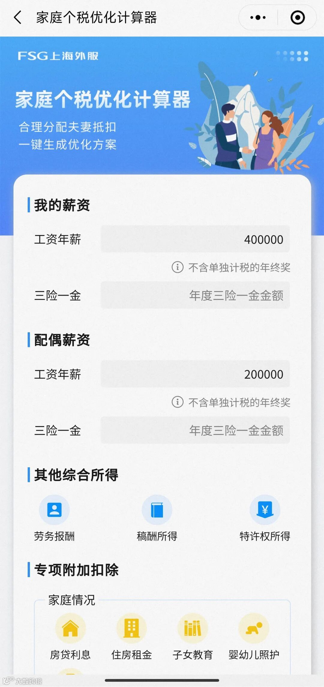 为此,上海外服推出一款便捷的家庭个税优化计算器,操作起来也非常简单,只要按要求输入夫妻二人的收入、三险一金、各项专项附加扣除及适用月份,这个住在手机里的“个税小管家”就可以快速算出最优的个税方案。