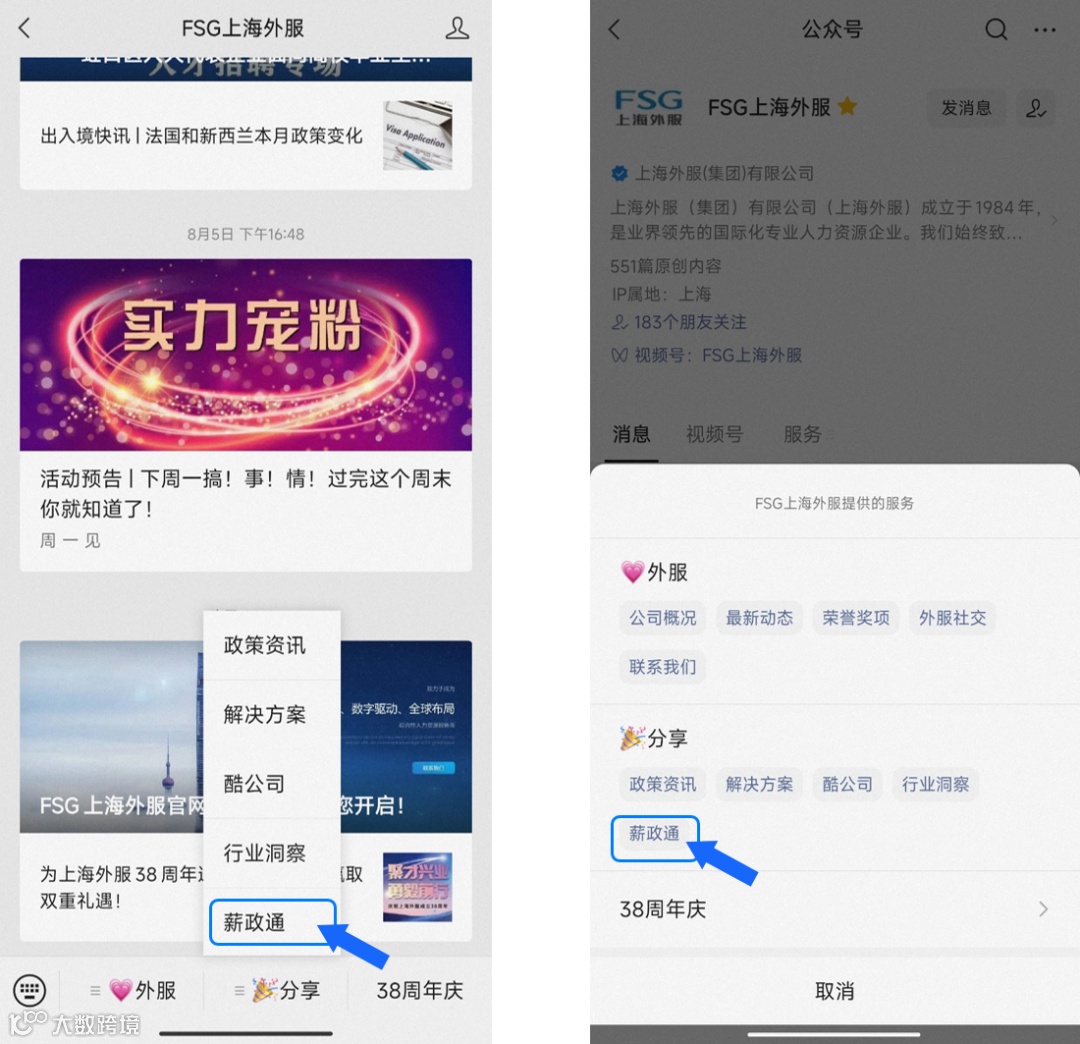 关注“FSG上海外服”官方微信公众号,点击菜单栏“服务”-“分享”-“薪政通”,进入薪政通界面: