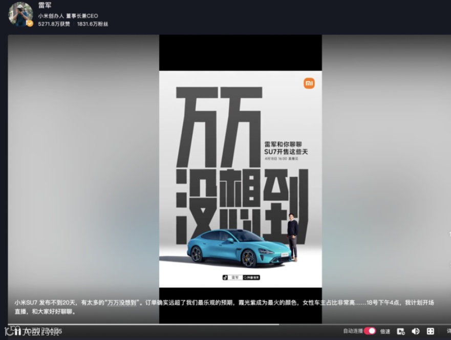 当日傍晚,雷军在微博发文称,“今天华为余总在他们的发布会上,调侃我们小米SU7原装手机支架的设计。”