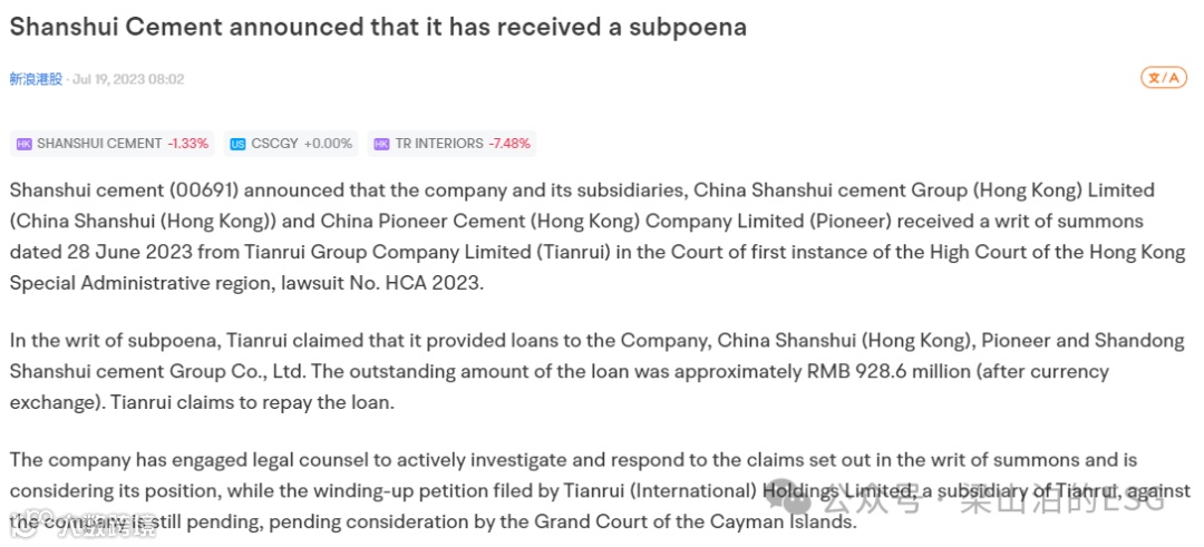 下图是2023年天瑞在香港起诉山水水泥索要10亿欠款的新闻: