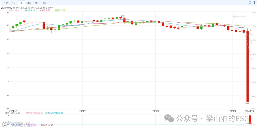 2024年4月9日港股尾盘:天瑞股价突然暴跌99%。开盘价格$5.1港元,收盘时价格仅为$0.048港元每股!