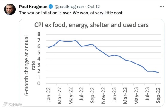 关键时刻,诺贝尔经济学奖得主保罗·克鲁格曼,出来喊了一嗓子:这场对抗通胀的战争已经结束了。美国赢了,以极小的代价取胜了。