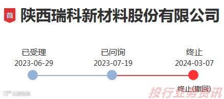 2024年3月6日,陕西瑞科新材料股份有限公司申请撤回发行上市申请文件,深交所决定终止对其首次公开发行股票并在创业板上市的审核。