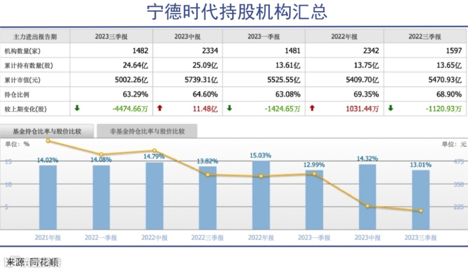 2021年四季度,127家基金公司共1676只产品重仓宁德时代,合计持有市值达1529亿元。到2023年三季度末,持股基金进一步降至1430只,持股机构数量和持仓比例呈现下降趋势。