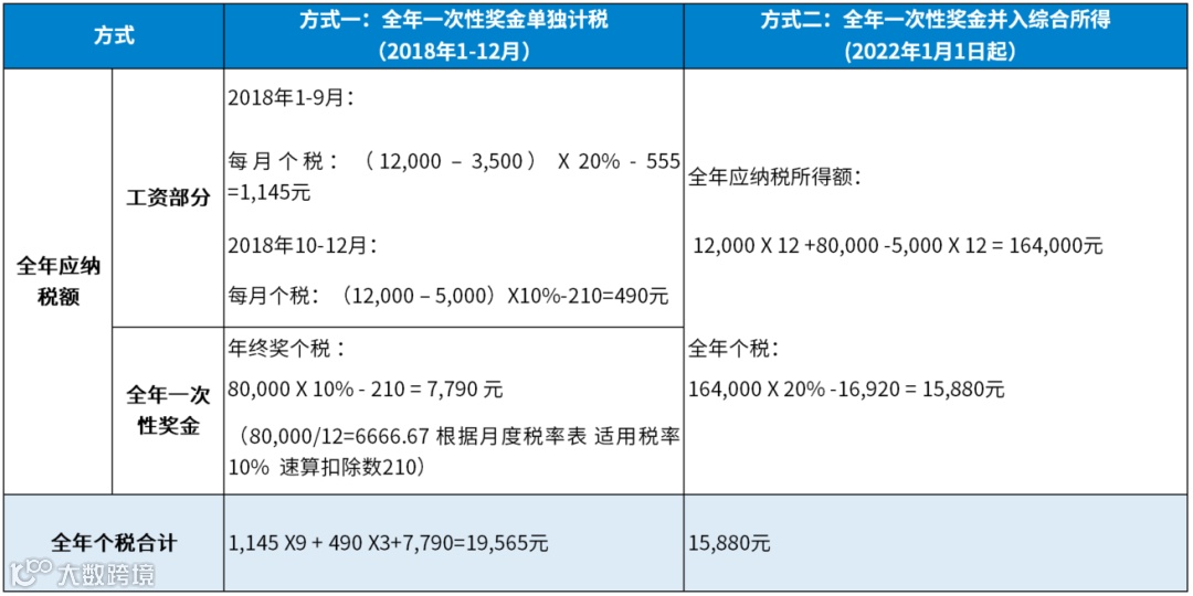 根据上述文件,在2021年12月31日前的过渡期内,全年一次性奖金有以下两种计税方法的选择。2022年起,居民纳税人只能选择第二种并入当年综合所得的计算方式。