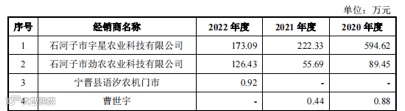 值得一提的是,公司与劲农农业之间的销售金额,还存在数据披露前后不一的情况。在与经销商的交易情况披露中,报告期各期,联适技术向劲农农业销售金额分别为89.45万元、55.69万元、126.43万元;而在前五大客户的披露中,2020年,公司向其销售金额为684.95万元,前后差异颇大。