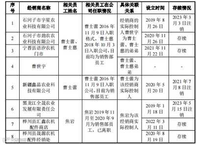 上述提及的曹世宇控制着联适技术三家经销商,劲农农业以外,还有石河子市宇星农业科技有限公司(下称“宇星农业”)、宁晋县语汐农机门市,两家公司三年与公司的交易合计990.96万元,不过,宇星农业已于今年3月注销。另外,曹世宇本人也与联适技术交易。