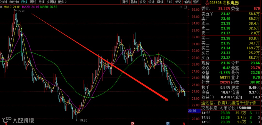 不过,老板电器的股价并没有随着新的代言人而大涨,5月29日、5月30日、5月31日,老板电器连跌三天,截止5月31日收盘,老板电器报于23.36元,总市值为221亿。
