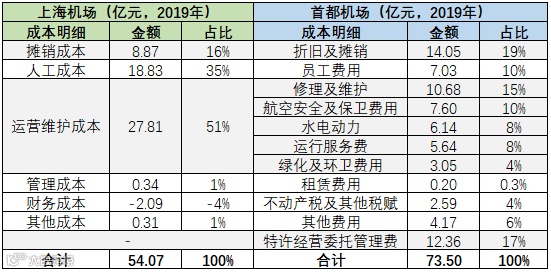 那么问题来了,既然业务规模大体相同,首都机场为什么比上海机场成本多出小20亿?
