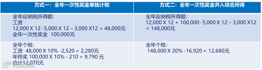 让我们看一下对于同样数额的全年一次性奖金,在两种计税方式下的区别: