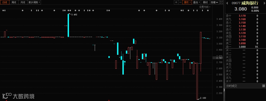 然而,好不容易登陆港股的威海银行,却并没有受到资本市场的欢迎,甚至坐上了“冷板凳”。不仅上市当日平盘报收,还很快就迎来了破发,此后直到目前,威海银行都再未曾重回最初3.35港元的发行价,甚至陷入长期“0成交”的窘境。
