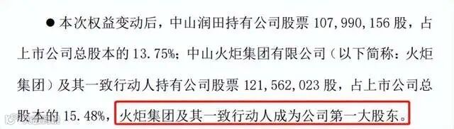 2023年1月18日,中炬高新公告,中山润田持有股票降至13.75%,火炬集团及其一致行动人持有公司股票总股本的15.48%,火炬集团及其一致行动人成为公司第一大股东。