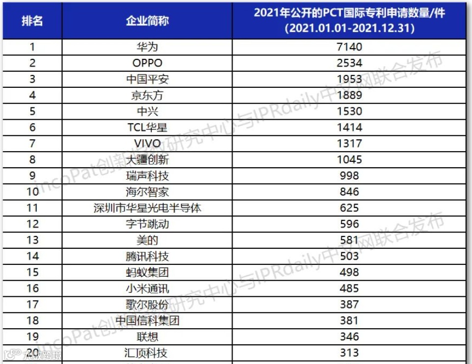 根据世界知识产权组织(WIPO)公开的2021年PCT国际专利申请数量: