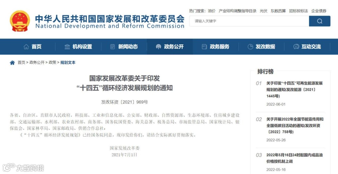 ▼2021年7月,国家发改委发布《“十四五”循环经济发展规划》