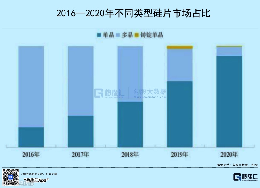 隆基创立于2000年以半导体起家,于2007年布局光伏单晶体硅片。在这个行业深耕了10多年,自主研发了电池端PERC、硅棒端RCZ、硅片金刚线切割等技术,叠加国家“领导者”计划推动,把单晶体硅片的成本大幅下降,让行业主流的多晶体硅几乎全部转移到单晶体硅路线。隆基经过这一役,也从小厂跃升为全球光伏龙头。