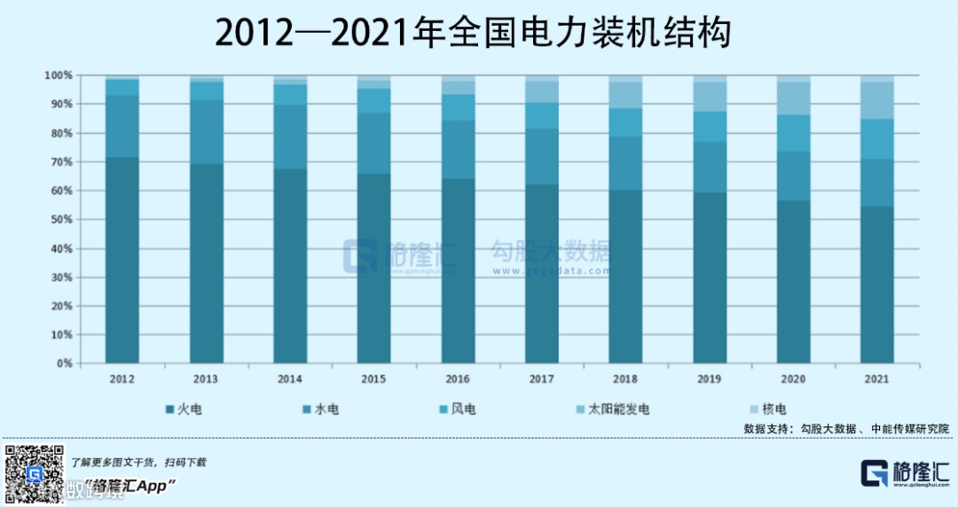 2021年发电结构中,火力、水力、风力、核能、光伏占发电总量的71%、14.6%、6.99%、5.02%、2.26%。