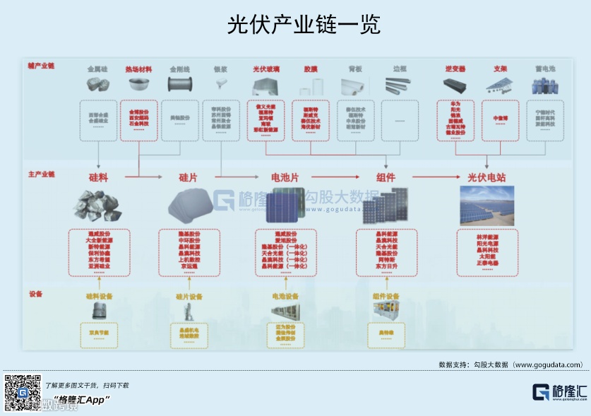 光伏主产业链中,最上游的硅料领域,主要玩家有通威股份、大全新能源、保利协鑫等;硅片领域,有隆基、中环、晶科能源、上机数控、京运通等;电池片领域,有通威、爱旭、隆基、天合光能等;组件领域,有隆基、晶科、天合光能、晶澳科技等;最下游的光伏电站领域,有阳光电源、太阳能等。除此之外,辅产业链,还包括光伏玻璃、逆变器、支架、胶膜以及设备等。