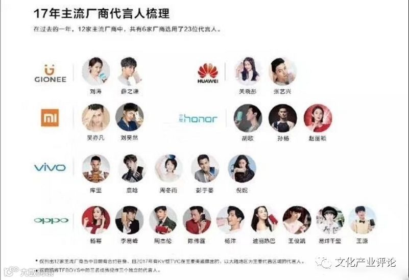 流量是变现的基础,尤其在粉丝经济火爆的当下,打流量牌依然是各实力品牌的重要招数,于是代言人比拼也是让消费者看着“肉疼”。2017年光是手机品牌主流厂商,就是星光熠熠。