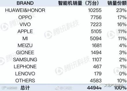 近两年,国内手机品牌竞争激烈,从国内市场来看,2017年华为以1.02亿部的销量排名第一,销量份额为23%。排在第二位的是oppo全年销量7756万部,第三位vivo为7223万部,第四位苹果为5105万部。