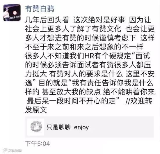 所以,正如CEO所说,他就是希望员工入职前就认同了这份压力(压榨)而在有充分思想准备的情况下欣然接受这份工作,这样的员工,既然进来了,面对这两年的互联网裁员潮,一般会舍不得这份看似还不错的薪资及福利,而不会主动去举报投诉,即使到最后忍无可忍跳槽走人,又往往急吼吼直奔下家而去,多半也就懒得再生枝节,耽误了开创新天地的时机,也担心新公司知道了会对自己有偏见,认为这位员工有点难搞,当然,新公司如果是有赞的“死对头”(有吗?