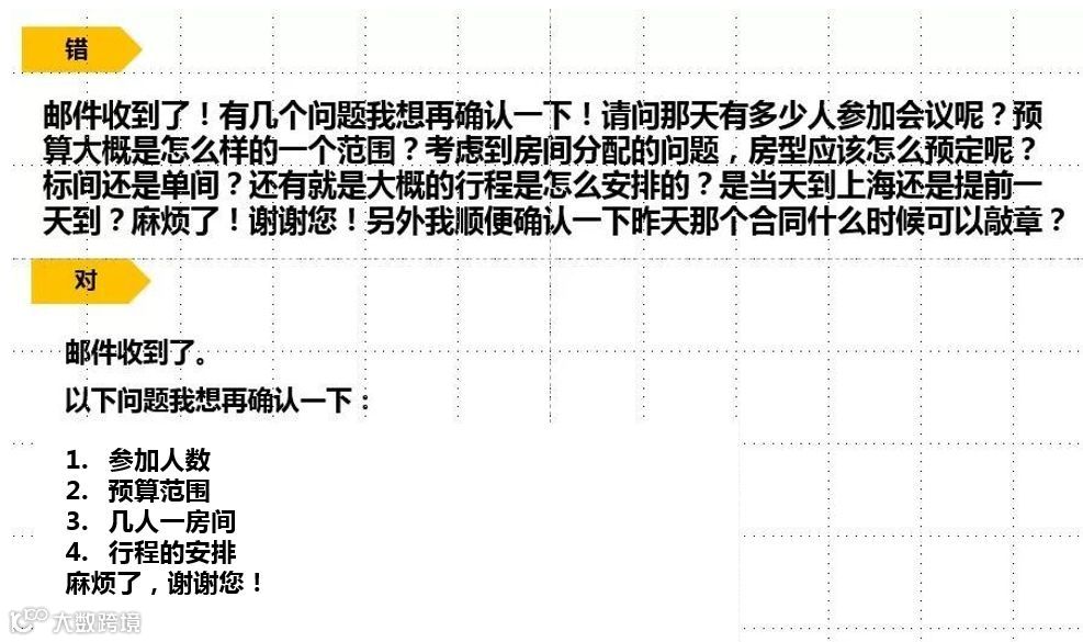 当邮件正文中出现的内容主题超过1个时,如果你把这几个不相关的主题合并在一份邮件中阐述的话,很容易让收件人忽略部分内容而误事。
