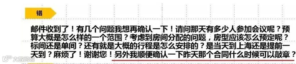 错误分析:上述邮件示例,主要错误原因为发件人将两个重要的内容混杂到了一封邮件之中,很容易让收件人忽略掉重要信息。针对这种情况,我们建议发送两封邮件来表达两件不同的事情。