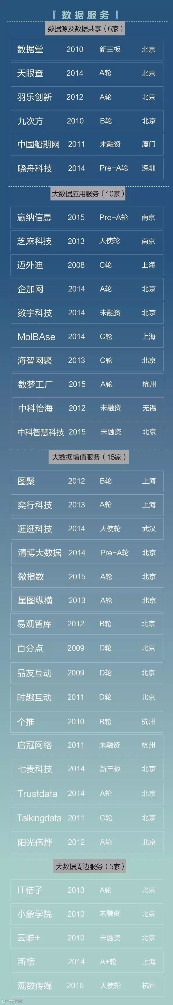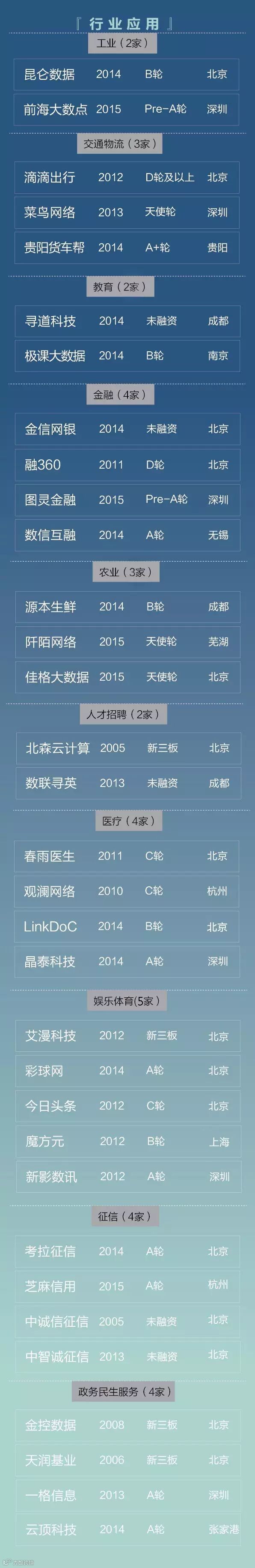 我们虽然为各小类中都挑选出至少1个代表性企业,但是各分支领域的发展情况并不均衡。创业公司多集中在征信、金融等领域。工业、农业等领域的公司较少,而这些恰恰是用数据改造后可以大幅提升行业效率、节约资源的领域,也是中国传统行业进行升级改造,弯道超车的又一次重要机会,我们希望可以看到更多的创业公司能对第一、第二产业提出数字化解决方案和服务。