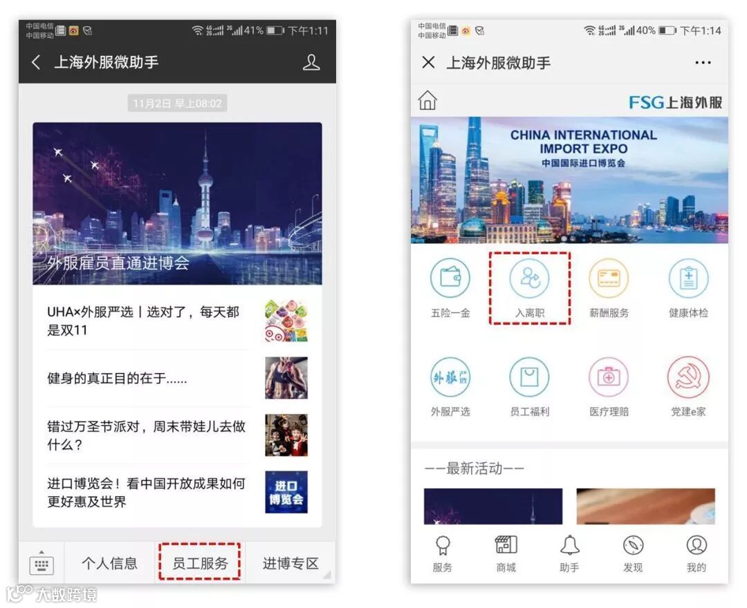 第一步:进入“上海外服微助手”,点击“员工服务”,选择“入离职”。