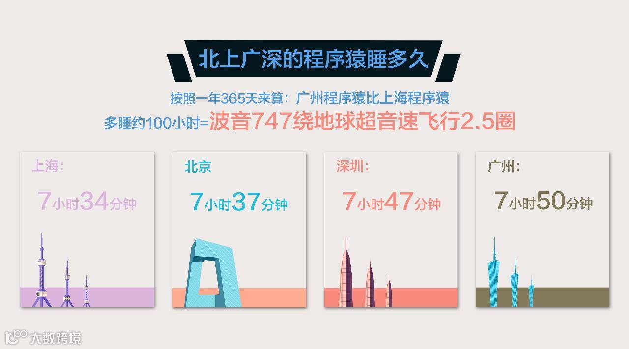 全国程序猿平均睡眠时间为7小时38分钟,上海和北京的程序猿们拖了后腿,深圳和广州的程序猿们超过平均睡眠时间。其中广州比上海每天多睡16分钟,按一年365天来算,这时间相当于波音747绕地球超音速飞行2.5圈!