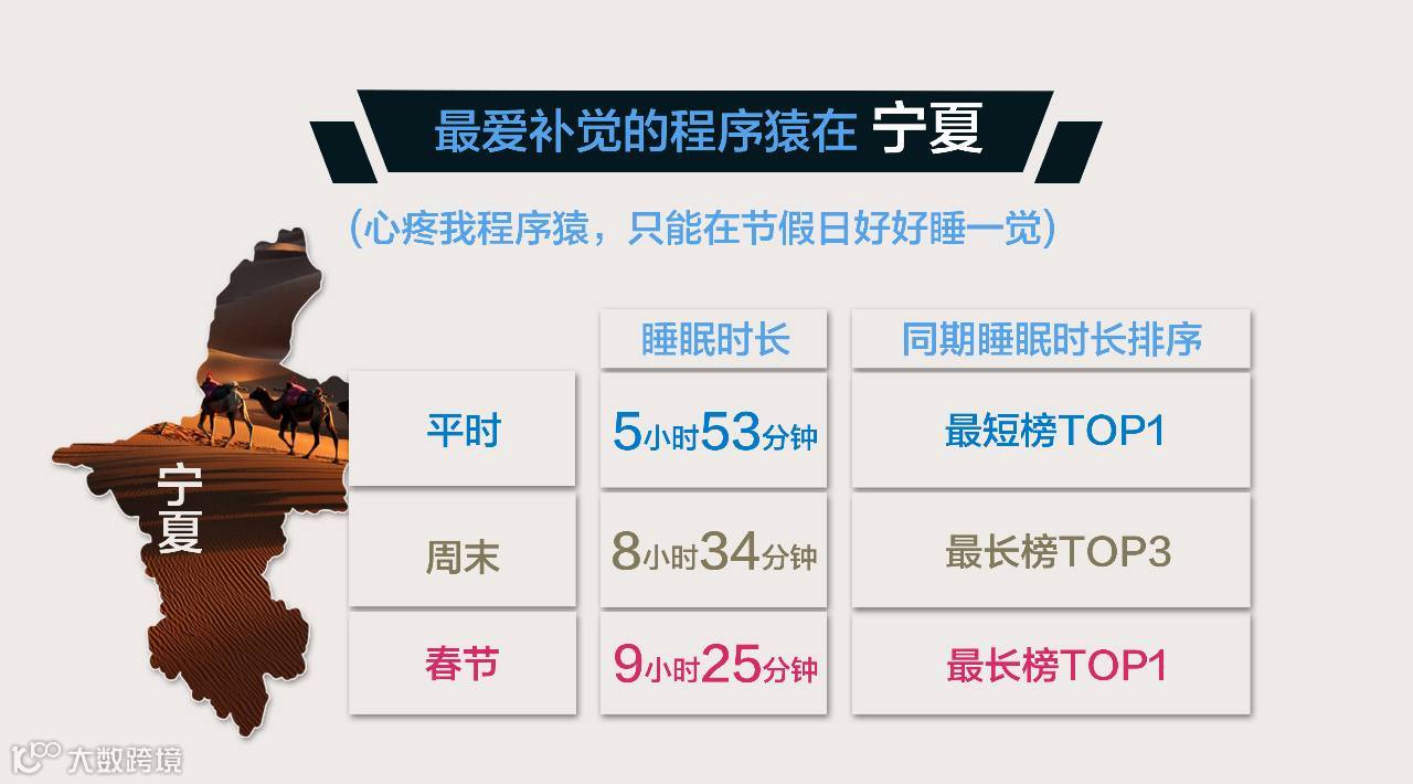 作为睡眠最短榜的榜首,宁夏的程序猿补觉老狠了。平时只睡5小时53分钟的他们周末睡了8小时34分钟,今年春节更是以9小时25分钟的睡眠时长稳居睡眠最长榜的TOP1!心疼我猿,一年也睡不了多少好觉。