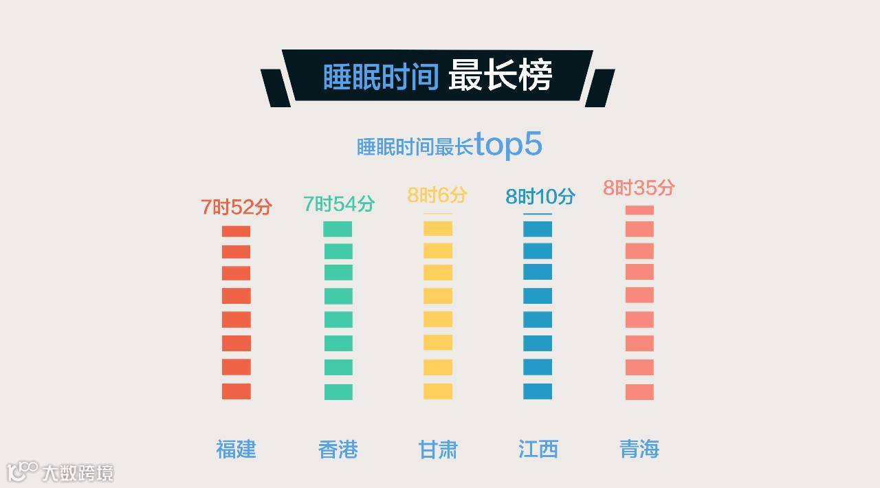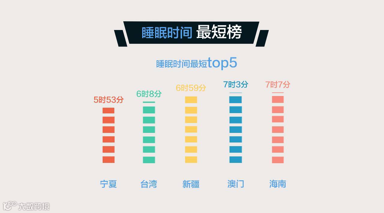 睡眠时间最短榜TOP5分别是宁夏、台湾、新疆、澳门、海南,尤其是宁夏的程序猿们,为家乡的发展殚精竭虑,每天睡眠时间不到6小时。一入程序猿深似海,从此睡眠是路人。