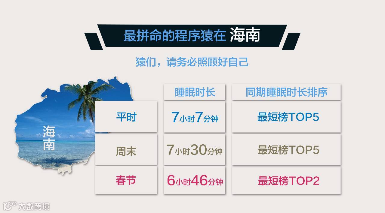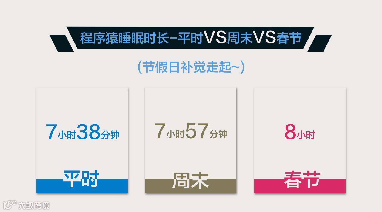 海南的程序猿平时睡7小时7分钟,周末小小地补了个觉,但是春节程序猿们都拼命得不要不要的,睡的比平时还要少21分钟。好拼命!收下小编这双膝盖!