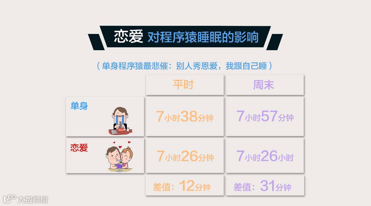 程序猿谈了恋爱之后,平时睡眠时间少了12分钟,周末睡眠时间少了31分钟。毕竟看电影、吃饭、逛公园……都是需要时间的嘛。单身的猿们,还是洗洗睡吧。