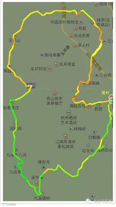 漫村客栈——虎跑后山——理安寺——九溪烟树——九泓亭——九溪十八涧——羽阳阁——裕泰茶庄——龙井村——棋盘山——天马山——绿茶——五老峰——南高峰——烟霞古洞——水乐洞——漫村