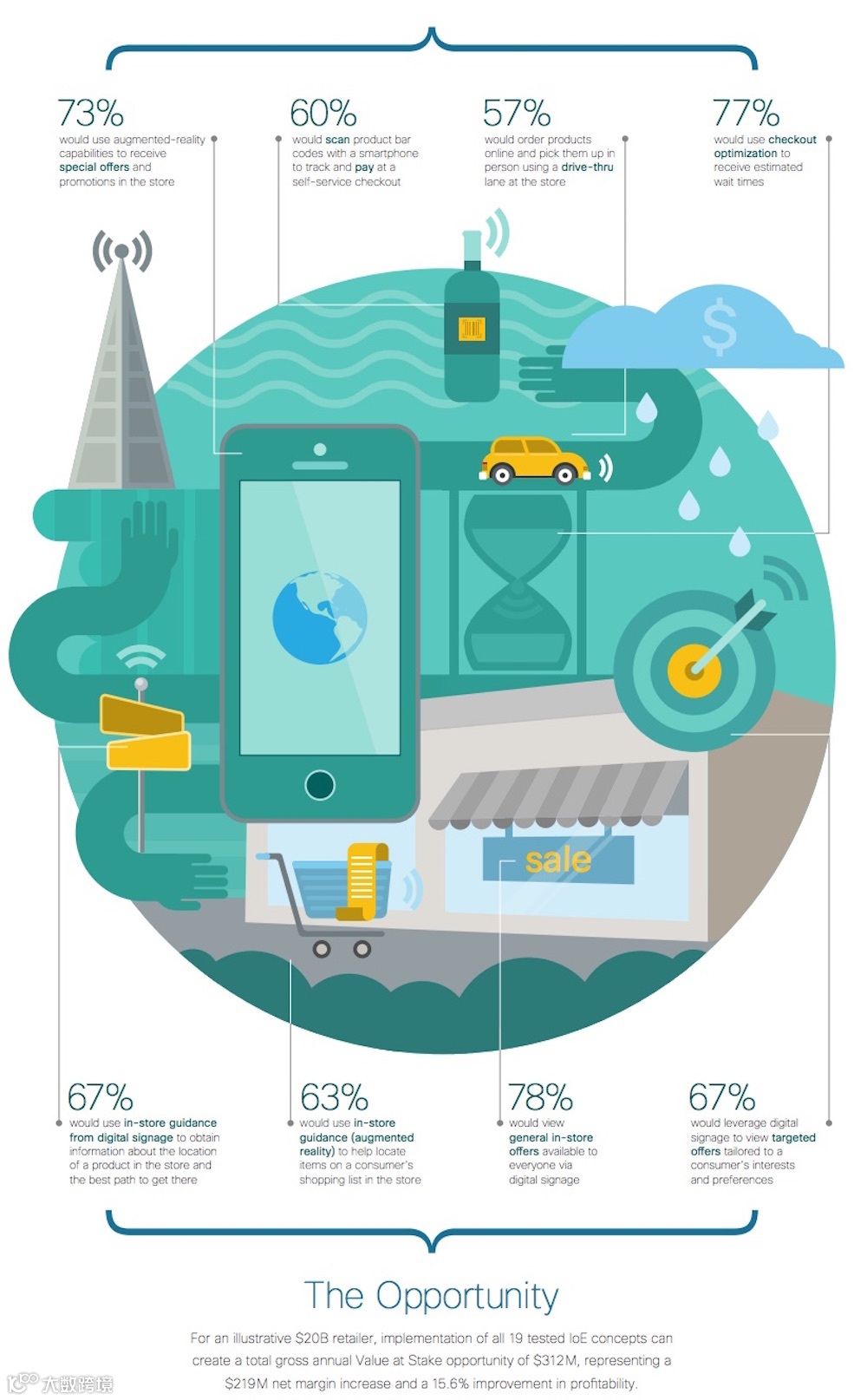 除了利用物联网之外,线下商店还可以通过虚拟现实、用 Beacon 技术实时推送通知来吸引顾客。思科的数据显示,对于规模为 200 亿的零售商,使用所有的物联网概念可以增加 2 亿多的净利润,将盈利可能提高 15.6% 。完善了结账流程和购物体验的线下商店更有可能实现对电商的“逆袭”。