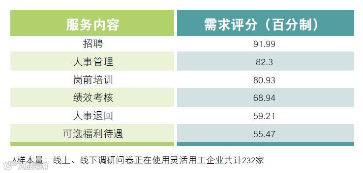 由人力资源服务企业提供的灵活用工服务包括人员招聘、岗前培训、人事管理、绩效考核、人事退回、员工福利六大项。通过对已使用灵活用工服务的232家企业的调研发现,企业最需要的服务是人员招聘,其次是人事管理和岗前培训。相比之下,企业对灵活用工员工的福利关注度并不高。此外,受访企业对灵活用工服务的整体满意度也不高,六项服务中没有一项超过4分(满分为5分)。相比而言,人事管理的满意度最高(3.57分),之后依次为人事退回(3.46分)、福利待遇(3.3分)、人员招聘(2.65分)、绩效考核(2.71分)和岗前培训(2.6分)。