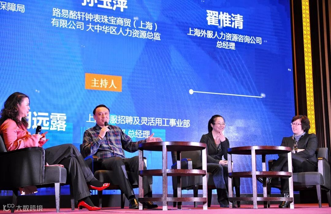 嘉宾右起为:路易酩轩钟表珠宝商贸(上海)有限公司大中华区人力资源总 孙玉萍、静安区人力资源和社会保障局副局长潘红眉、 上海外服人力资源咨询公司总经理翟惟清,主持人:上海外服招聘及灵活用工事业部业务发展部总经理胡远露