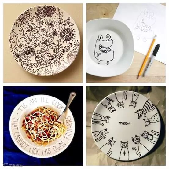 在盘子上随性创作一番后,只需把盘子在150度的烤箱中放置30分钟,图案就会像印上去的一样洗不掉啦。