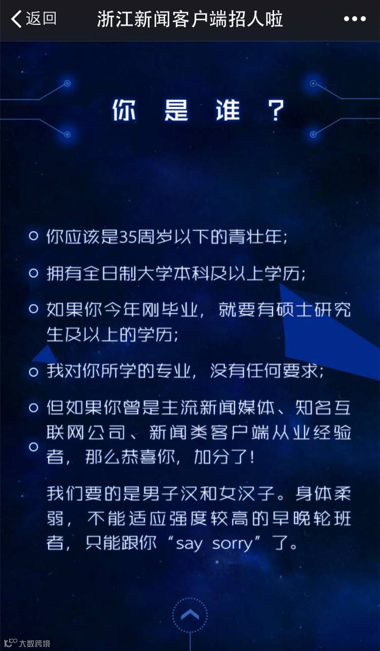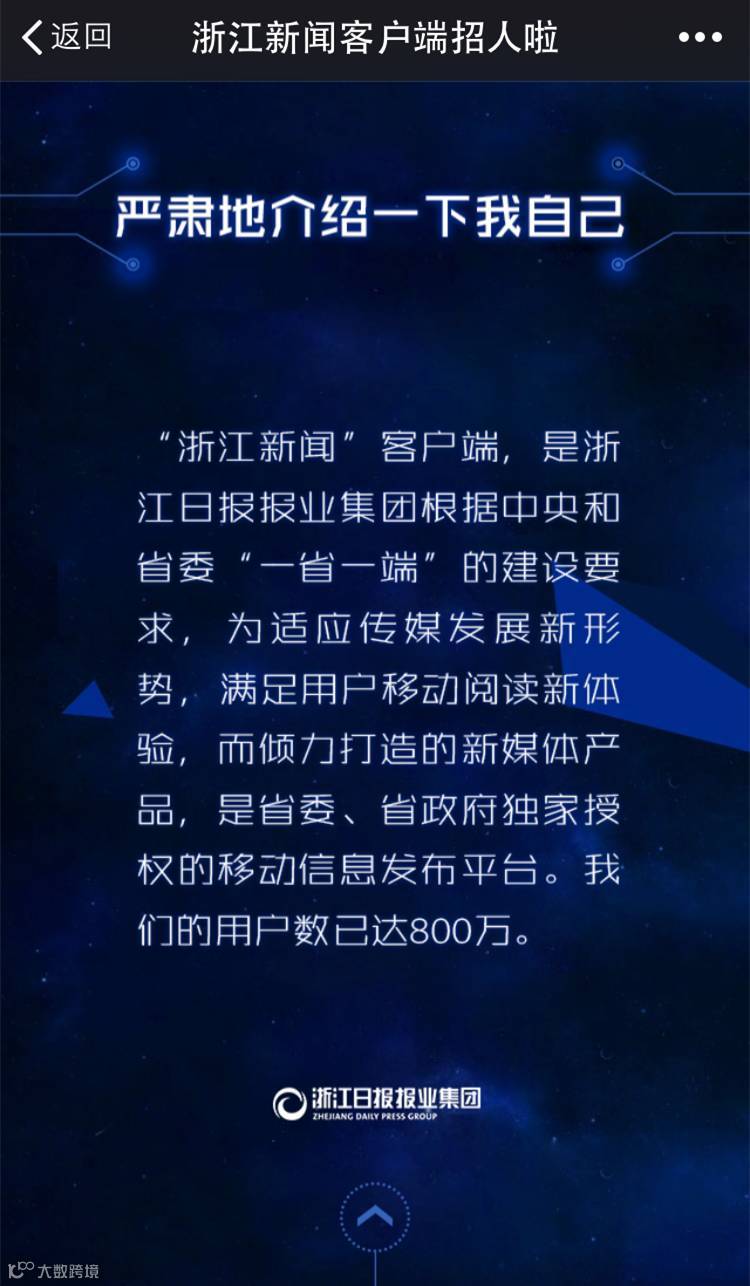 导读:“浙”里招人啦!“浙江新闻”客户端招聘启动自我介绍人员要求岗位:新闻频道采编 3人岗位:地市频道采编 4人点