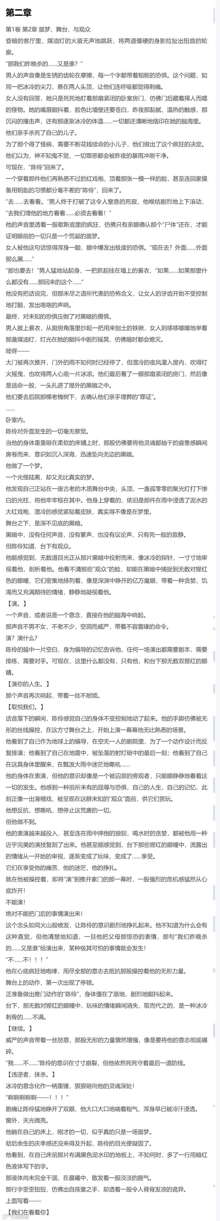 梦境舞台的设定很惊艳。这不是一个简单的噩梦,而是一个规则明确的里世界。“观众”,“表演”,“取悦我们”这些关键词,把主角变成了一场被强制观赏的戏剧,让读者能带入到这种恐怖氛围中。