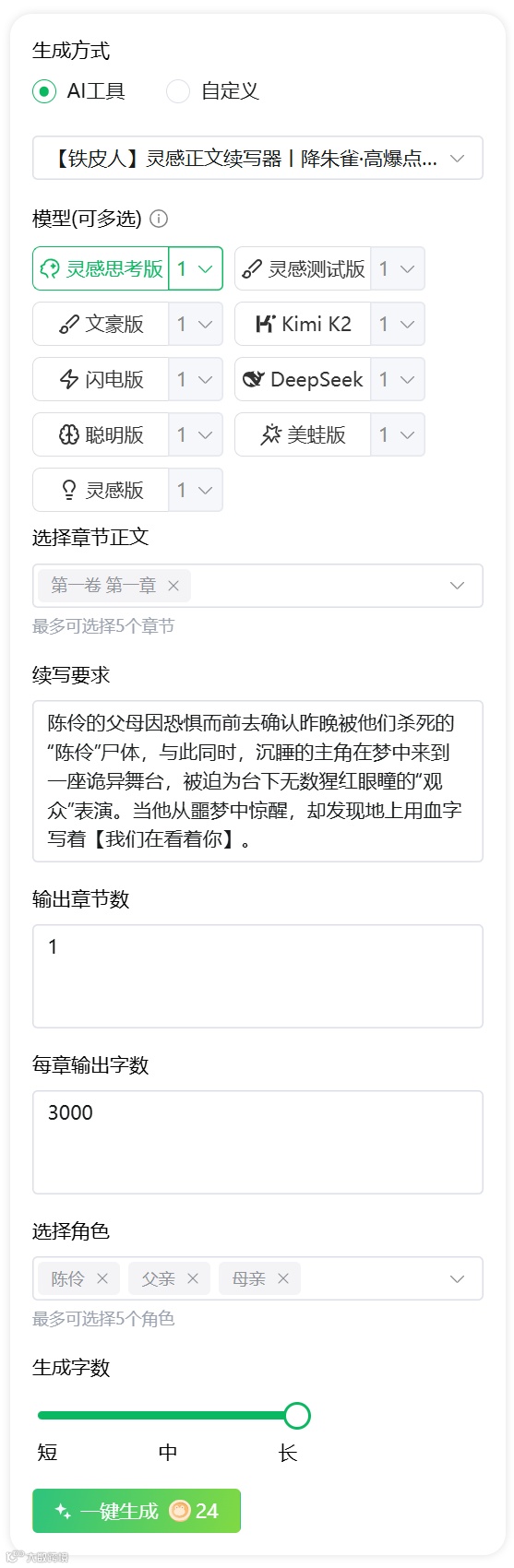 输出章节数:我选择了【1章】,想看看它短文字内剧情铺垫和展开的能力。