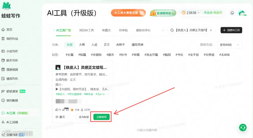 就在我上周又一次陷入这种“码字后贤者时间”时,我在蛙蛙写作的AI工具广场里,发现了一个名字很“嚣张”的工具——【铁皮人】灵感正文续写器。