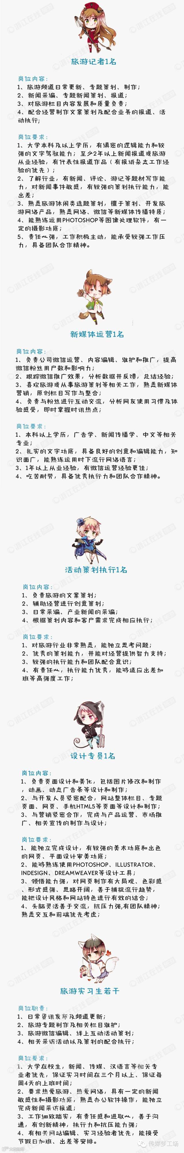 | 全媒体营销专员 | 1.负责报纸、微信公众号、APP等全媒体资源的整合营销; 2.负责策划并执行跟旅游相关的线下活动方案; 3.分析竞争对手的全媒体实践,为团队制定营销策略提供依据。 |