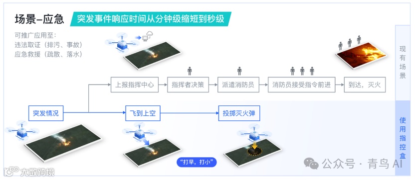 【快响应】:在应急场景下,无人机不需要等待地面指挥官的确认,自主执行速度更快,可以抢占紧急情况下的时间窗口。