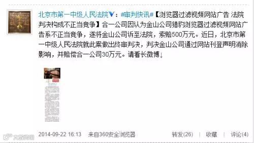 上市的上市,破纪录的破纪录,有公司的地方就会有竞争,纠纷自然也少不了。猎豹安全浏览器“页面广告过滤”功能被优酷网经营者合一公司诉至法院。合一认为,金山此举系不正当竞争,索赔500万元。昨日,北京市第一中级人民法院终审认定金山违反《反不正当竞争法》,需通过网站刊登声明消除影响,并赔偿30万元。