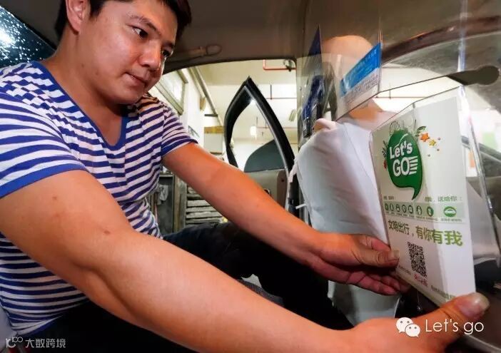 这几天,细心的打车族可能已经留意到,很多出租车上都出现了Let's go的身影。这张贴纸就贴在每辆出租车上后排的防护栏上。