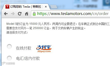 特斯拉进入中国早已不是什么新鲜事儿了,不过最近支付宝高调宣布,支付宝与特斯拉已达成合作,从4月24日起,特斯拉中国官网将与支付宝进行“无缝”对接。Tesla中国官方支持两种支付方式:一是通过电汇或店内付款,二是支付宝在线付款,这也意味着Tesla终止了与快钱的支付合作。面对无孔不入的阿里支付宝,腾讯微信支付或财付通又将如何应对呢?二蛋相信“双马大战”至少在短时间内还将是中国互联网界的“主旋律”。
