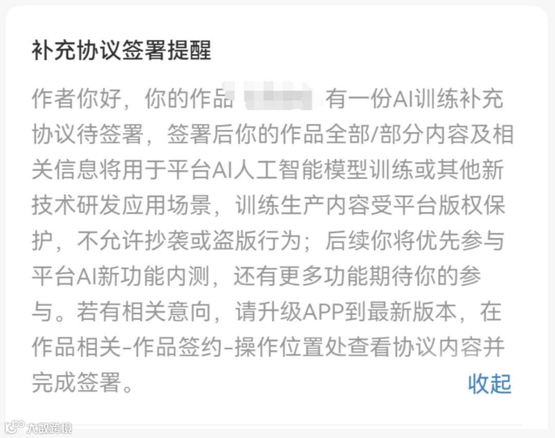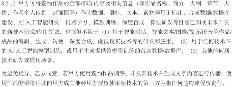 先是有网文作者发帖称,签约协议中增加了“AI训练补充协议”,要求作者同意把作品“喂”给平台的AI,用于内容开发。