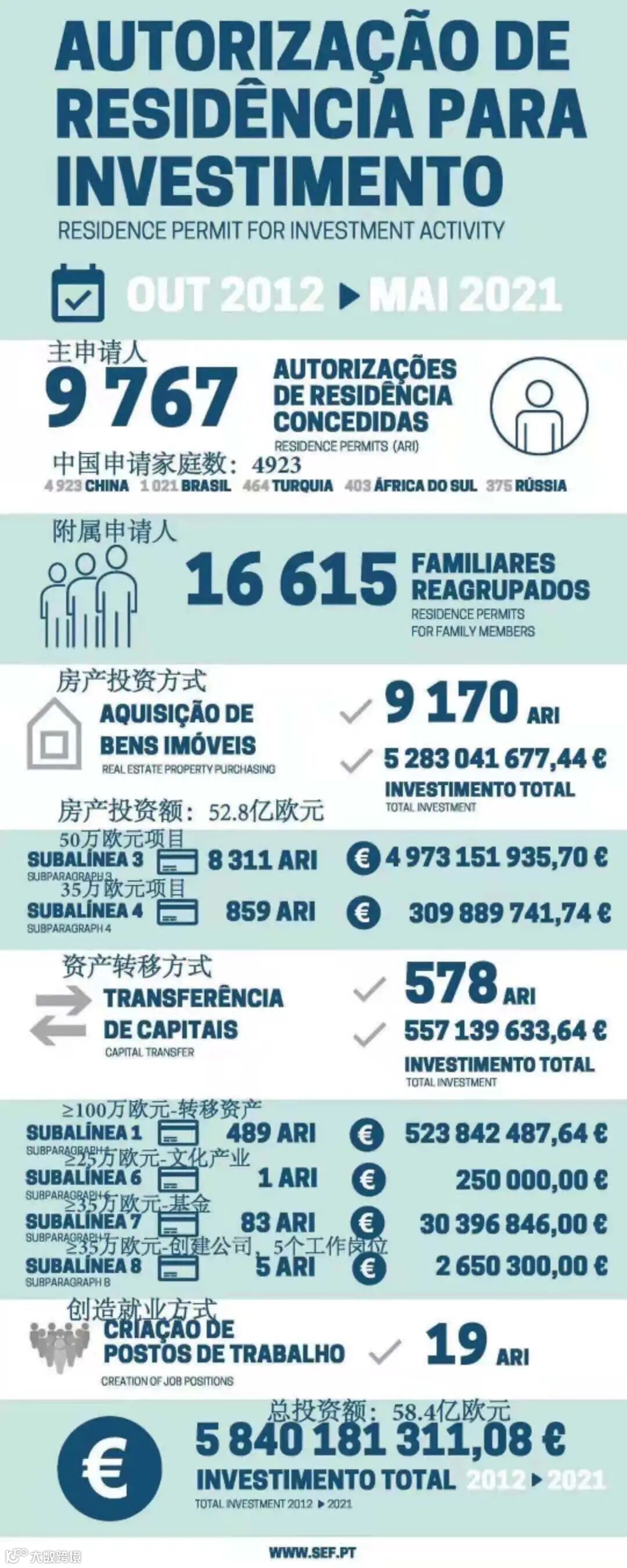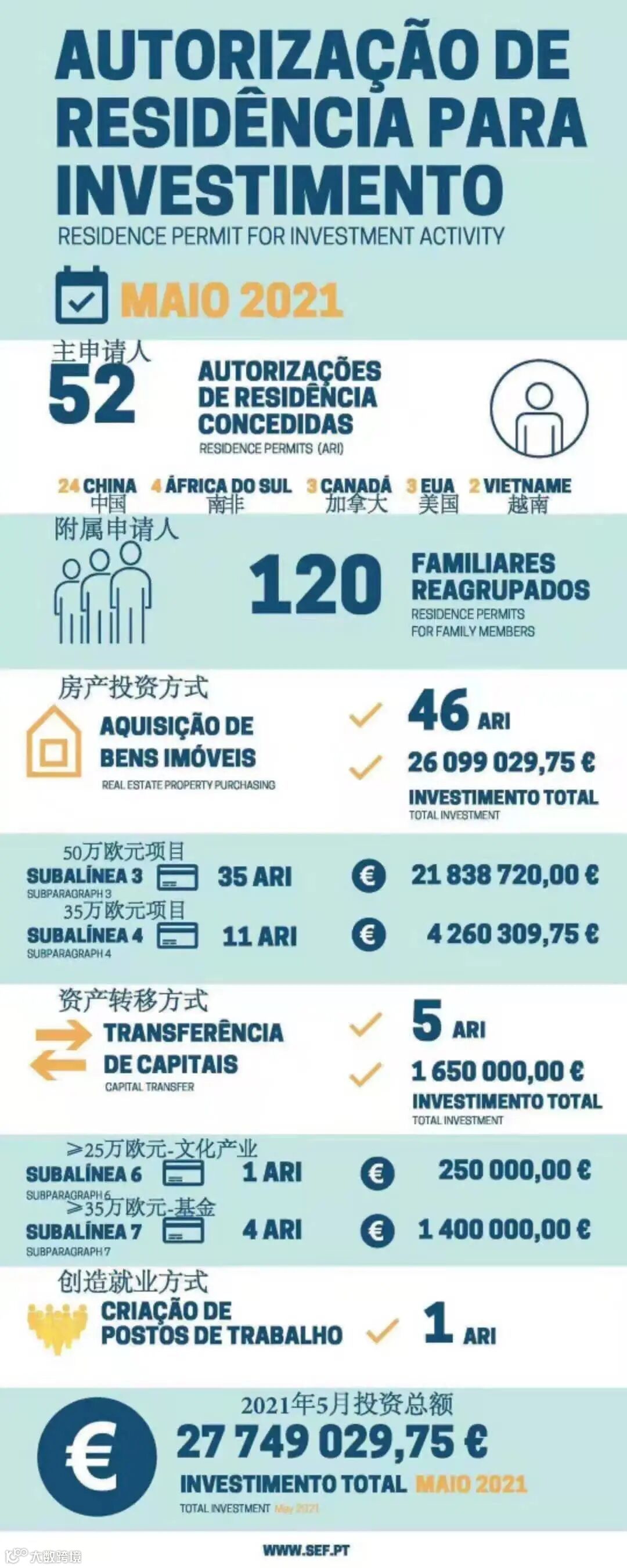 近期,葡萄牙移民局官网更新了2021年5月黄金居留许可大数据,让我们一起看看葡萄牙的投资数据发生了哪些变化。