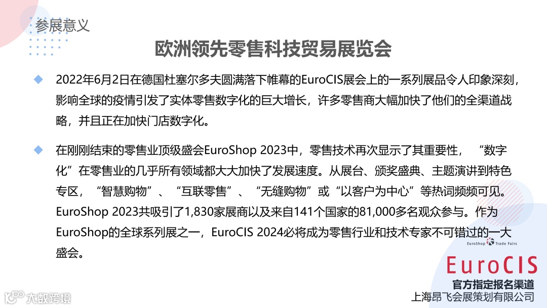 导读:2024 EuroCIS 德国零售科技及设备展览会现已开启预定通道,欢迎来电咨询预定详情,昂飞会展期待与您一起参展!